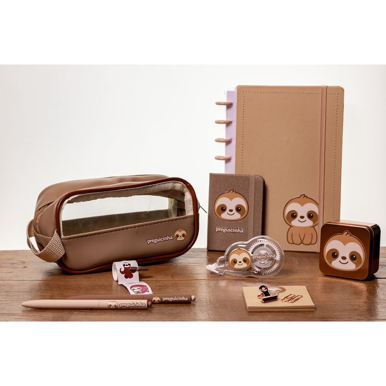 Bag + Estojo + 2 canetas + Corretivo fita + Adesivos + Lata com clips + bloco de anotacao + Caderneta + Caderno inteligente
