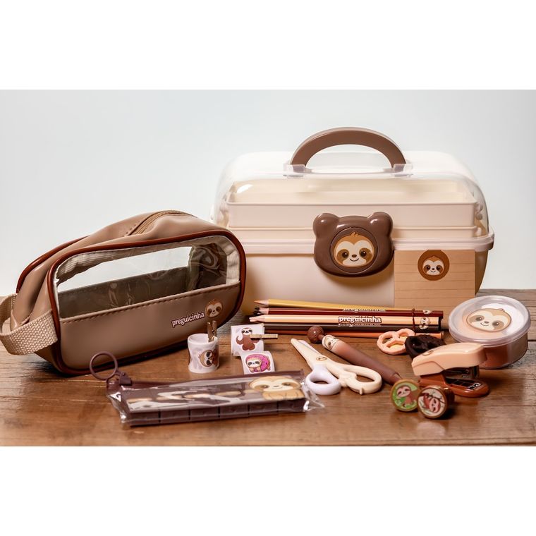 Maleta + 12 lapis de cor + Adesivos + Caneta + Massinha de modelar + Marca texto chocolate + Grampeador + Bloco de anotacao + 5 borrachas + tesoura + estojo + 2 carimbos
